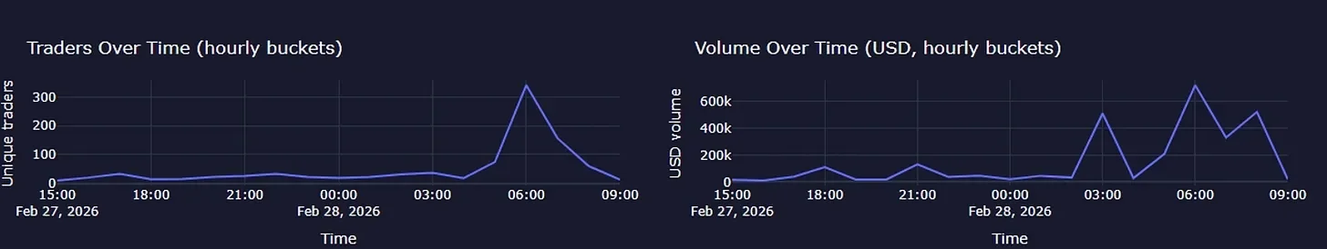 In the Iran strike markets, price movements told only part of the story. Timing told the rest. Around 11:30 PM EST on February 27th, we observed a clustering of heavy, high-conviction “Yes” bets.