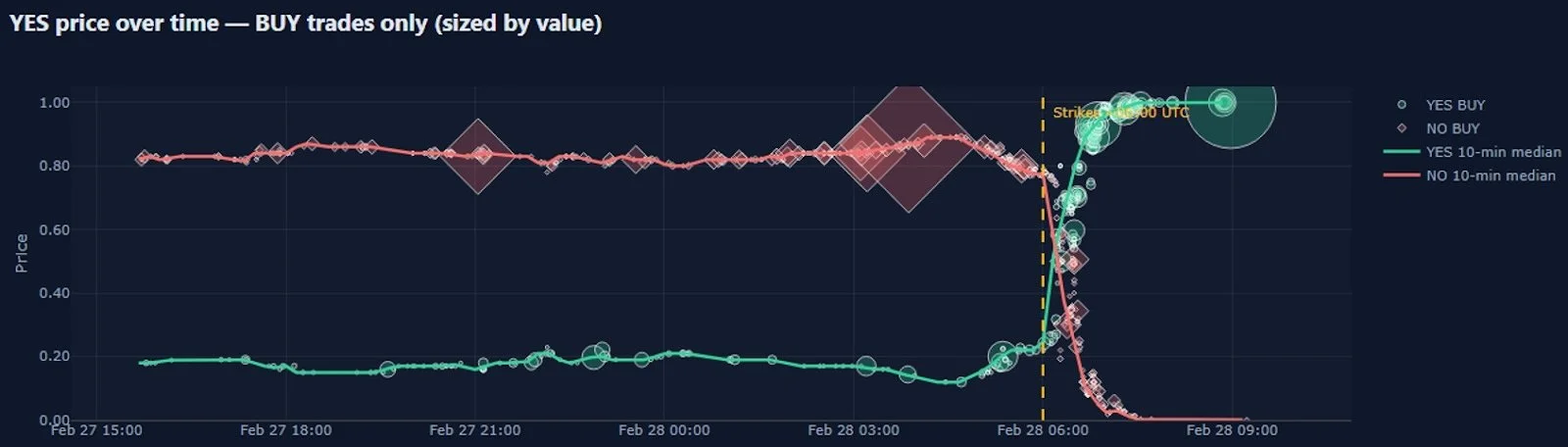 Chart via internal systems showing Iran strike markets. Size of the data bubble denotes the size of the bet placed. Note times in UTC (6AM UTC = 1AM ET)